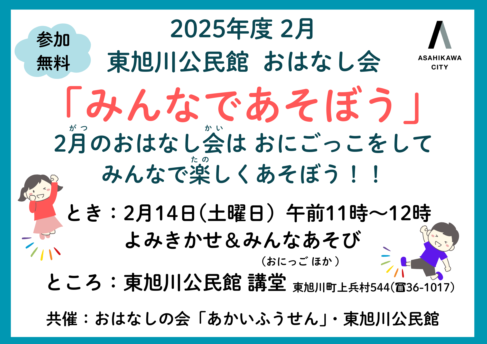 | 講座・イベント名 | 東旭川公民館 おはなし会「みんなであそぼう」 |