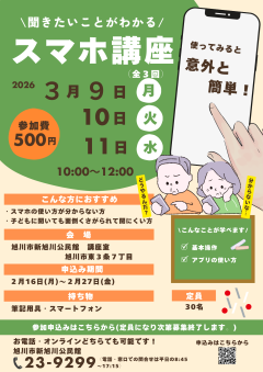 公開日:2026年02月16日成人教育旭川市新旭川公民館新旭川公民館「スマートフォン講座③」開催日:2026年03月09日(月)~03月11日(水)