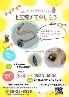公開日:2026年02月17日成人教育旭川市新旭川公民館新旭川公民館「七宝焼きを楽しもう②」イベント終了開催日:2026年03月04日(水)